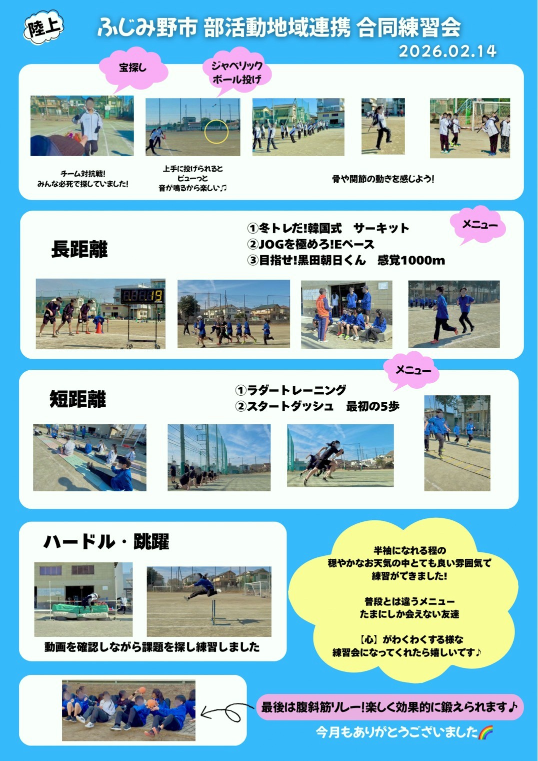 陸上競技は、大井中を拠点とし、江森コーチ、白井コーチ、甲斐コーチなどの指導経験豊富な指導者の皆さんによる指導サポートが行われています!短距離、長距離、跳躍などの各分野での、決め細やかなサポートは、大変充実した内容となっています。